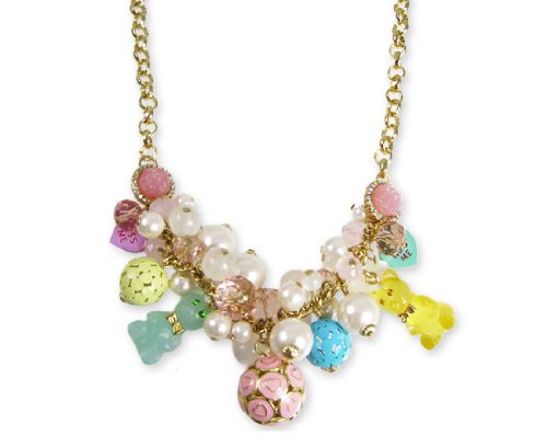 - Gold plated necklace with crystals, hand painted enamel, beads, and resin.