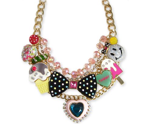 Gold tone necklace chain with multi chain y-neck, ice cream cone, fuchsia and white popsicle, multi-colored round candy charms