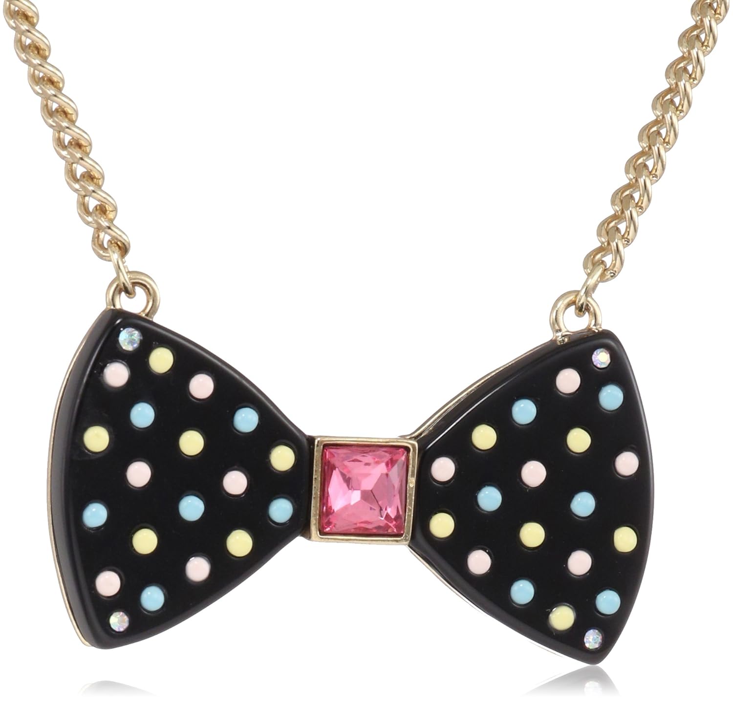Gold tone necklace chain, bow with multi-colored dots and crystal accents
