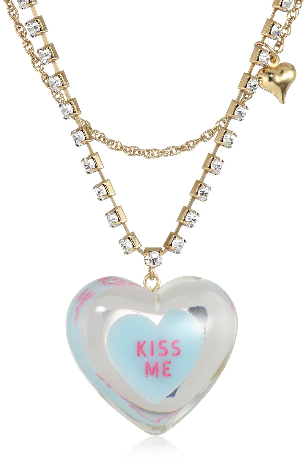 Gold tone necklace chain with crystal cup chain accent, blue ?KISS ME? heart pendant