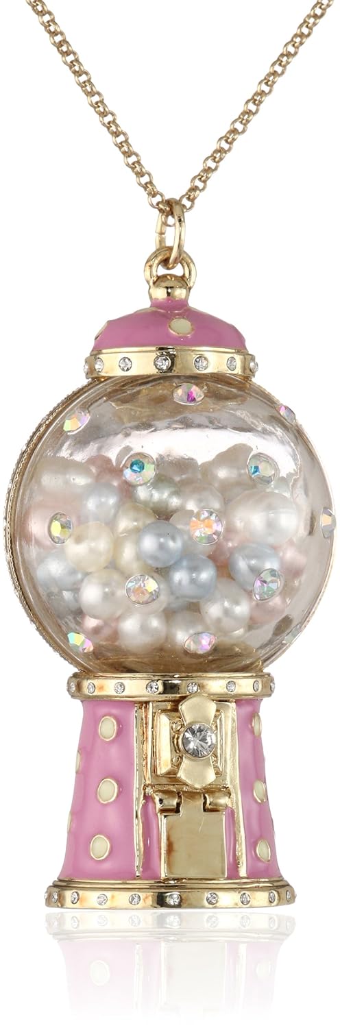 Gold tone long necklace chain with crystal cup chain accent, bow and popsicle , pink cotton candy cart pendant with crystal accents and gold tone details
