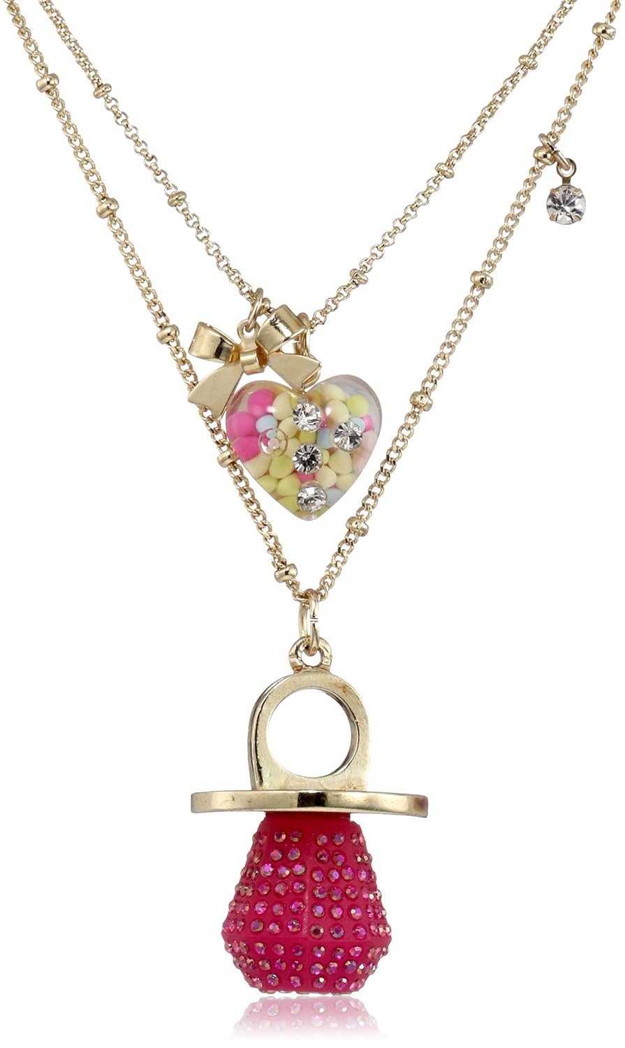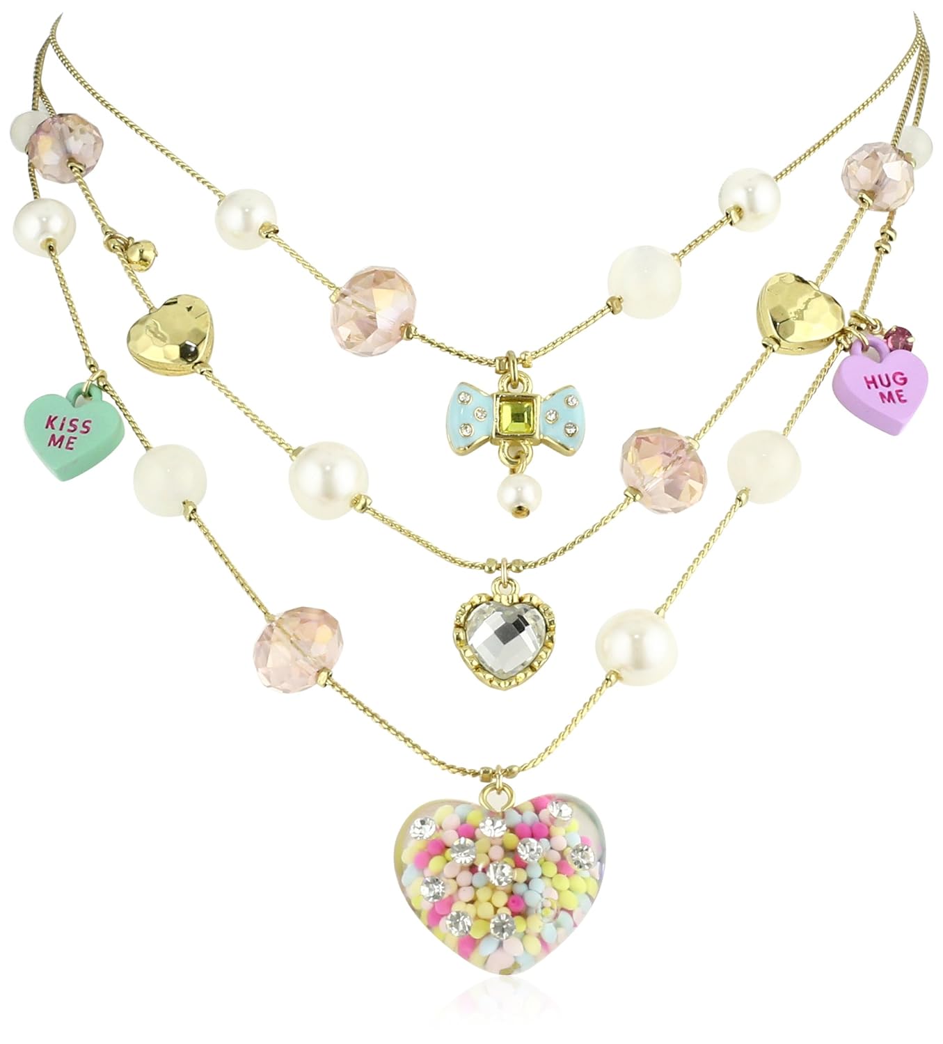 Gold tone necklace chains, pink candy ring with colored crystal accents, clear heart with crystal accents and multi-colored beads, gold tone bow, small crystal accent