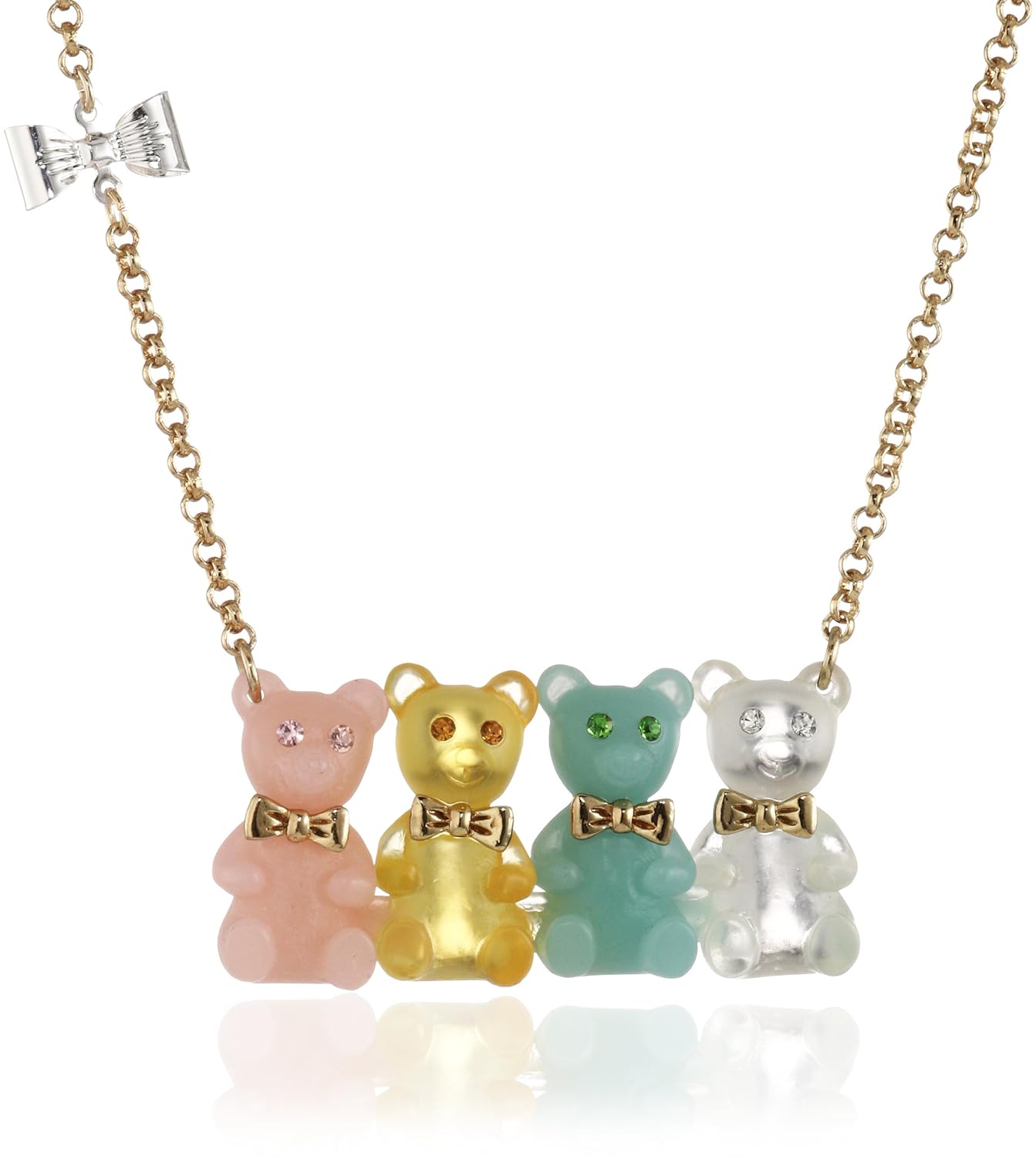 Gold tone necklace chain with bow accent, multi-colored gummy bears with gold tone bows and small crystal accented eyes