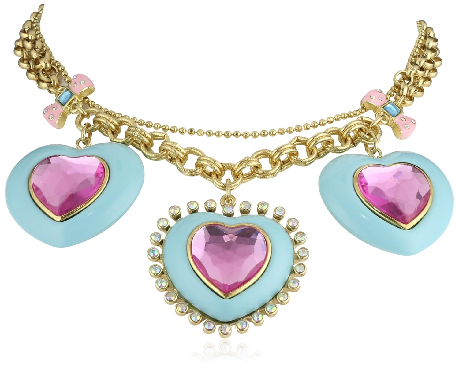 Gold tone necklace chains, pink bows with square crystal accent, blue hearts with faceted heart detail, middle heart outlined with small crystal accents